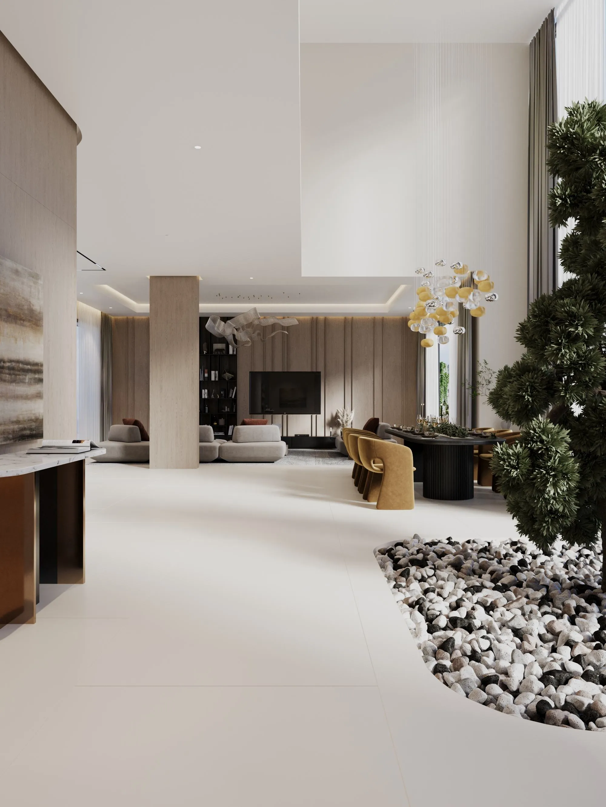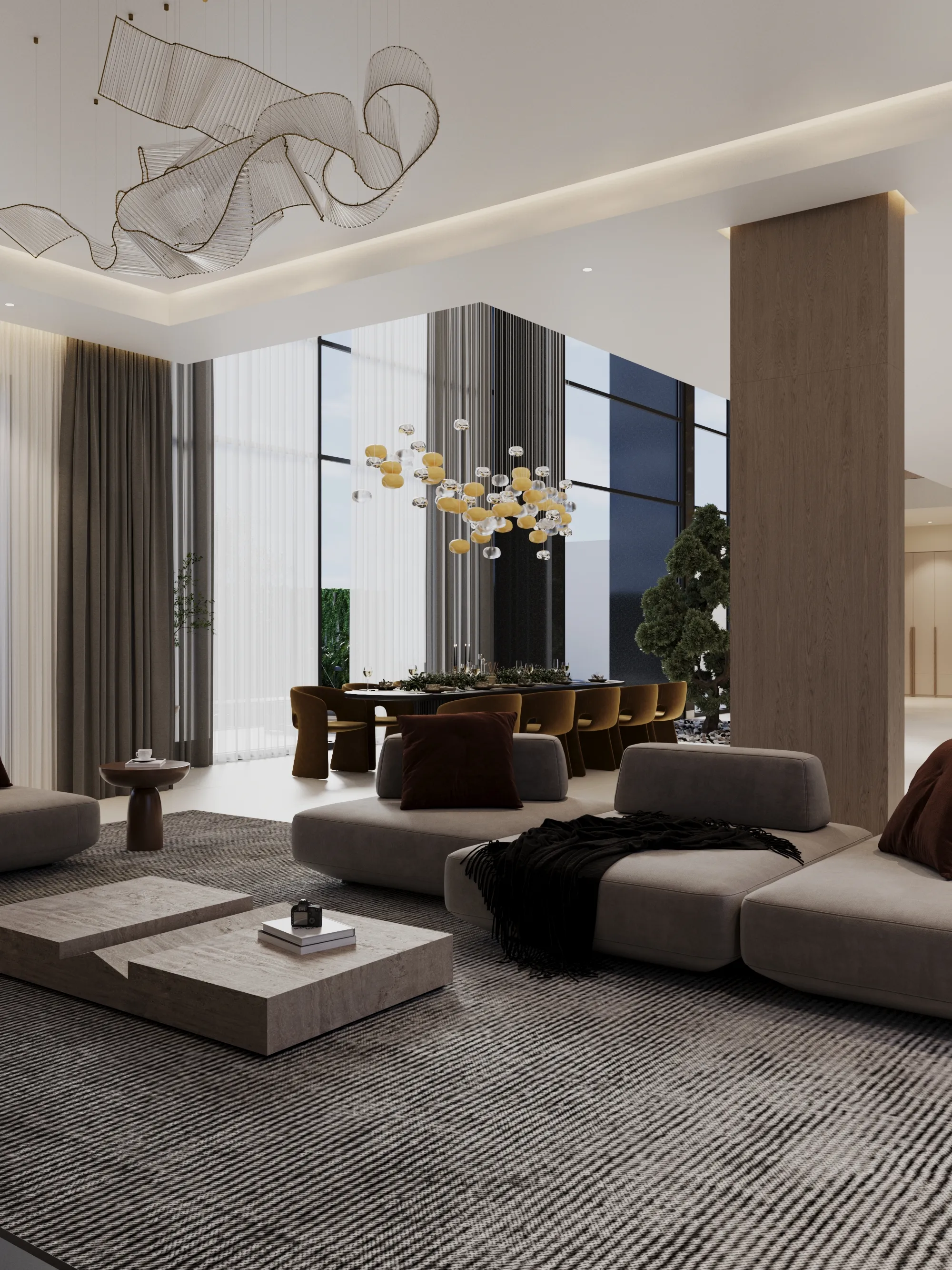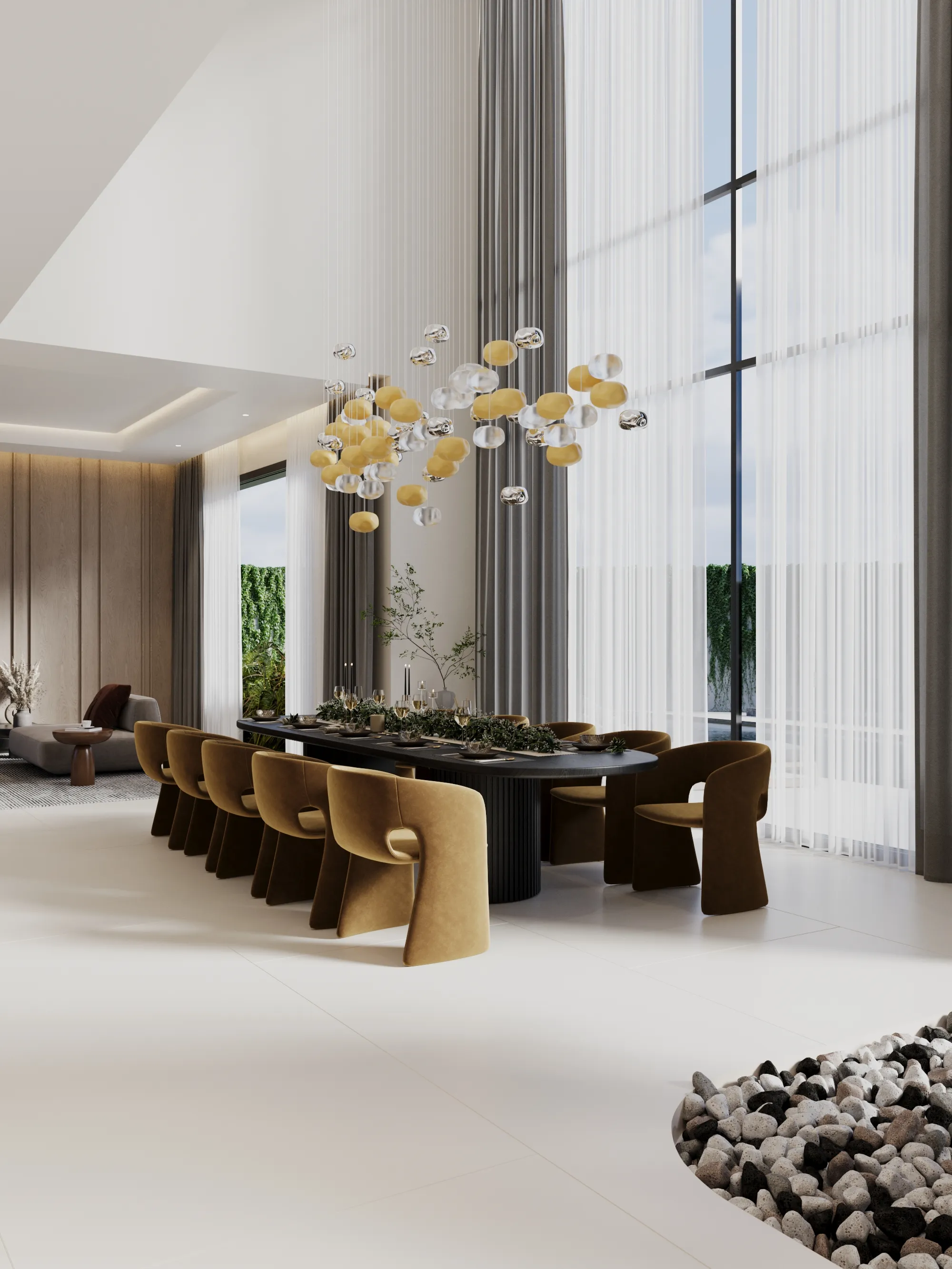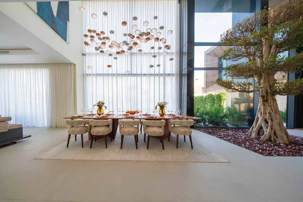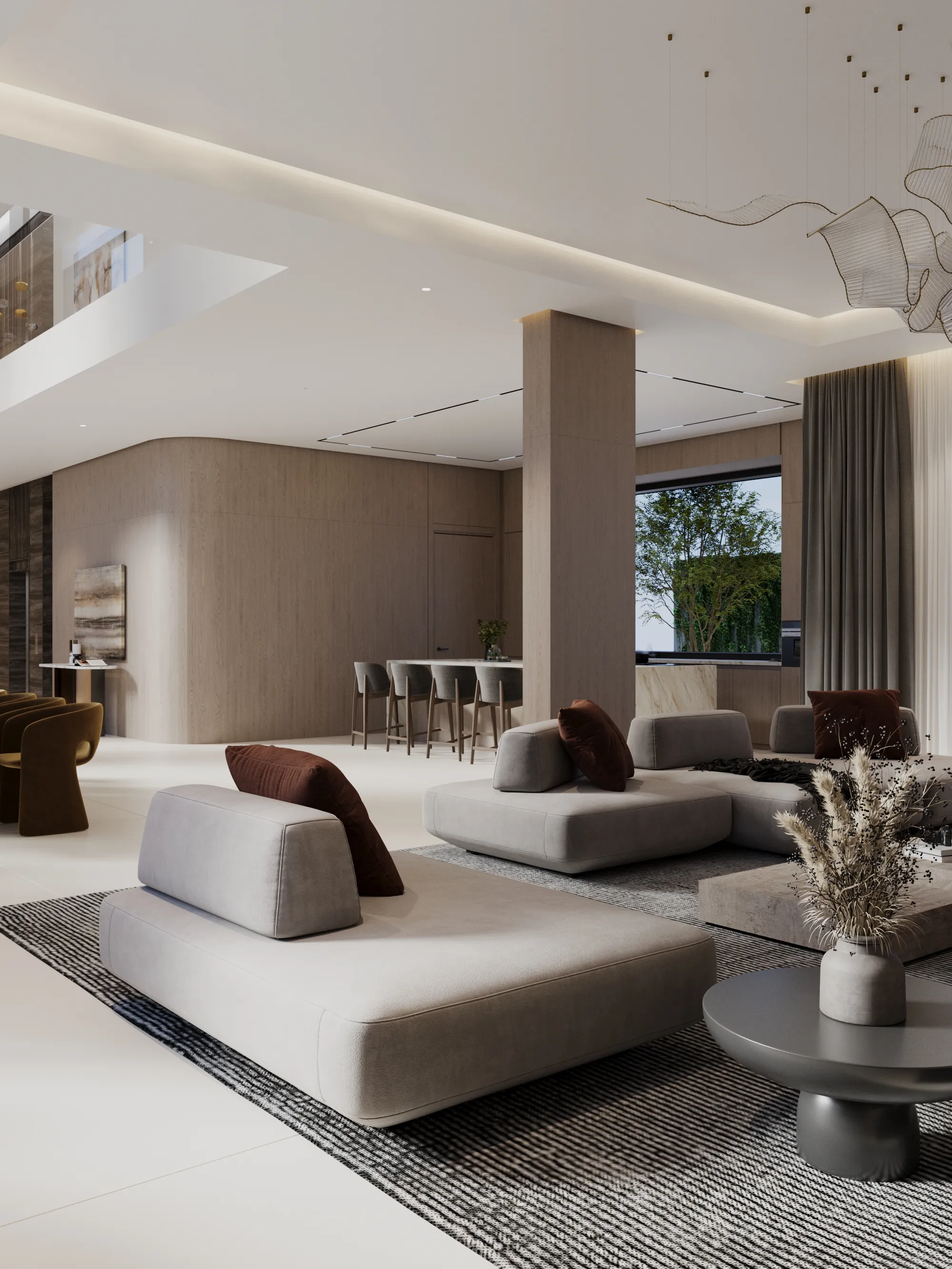 Interior spaces are crafted with a strong focus on material quality, detailing, and sensory comfort. Living areas are defined by dramatic ceiling heights and highlighted by statement lighting features that enhance spatial presence. Floors are finished with premium porcelain surfaces in common areas and hardwood flooring in private rooms, while bespoke wall treatments and architectural panels add depth and character throughout the villa. Kitchens are designed for both presentation and performance, featuring a front-of-house show kitchen alongside a discreet service kitchen, each fitted with premium appliances, custom cabinetry, and refined surface finishes. Furniture and interior styling include designer-selected pieces, plush carpets for acoustic comfort, and carefully curated furnishings that create a warm yet sophisticated living atmosphere.
