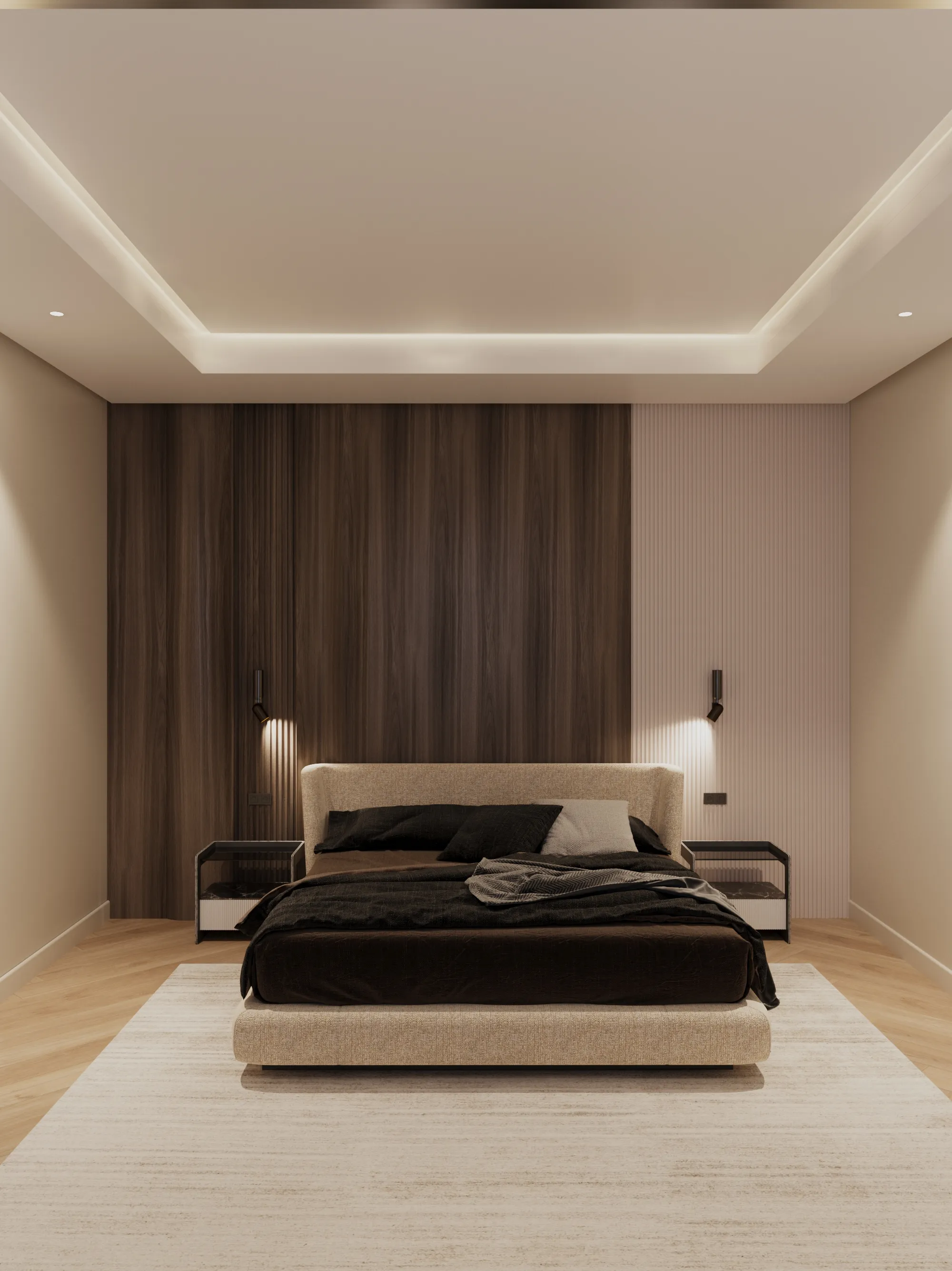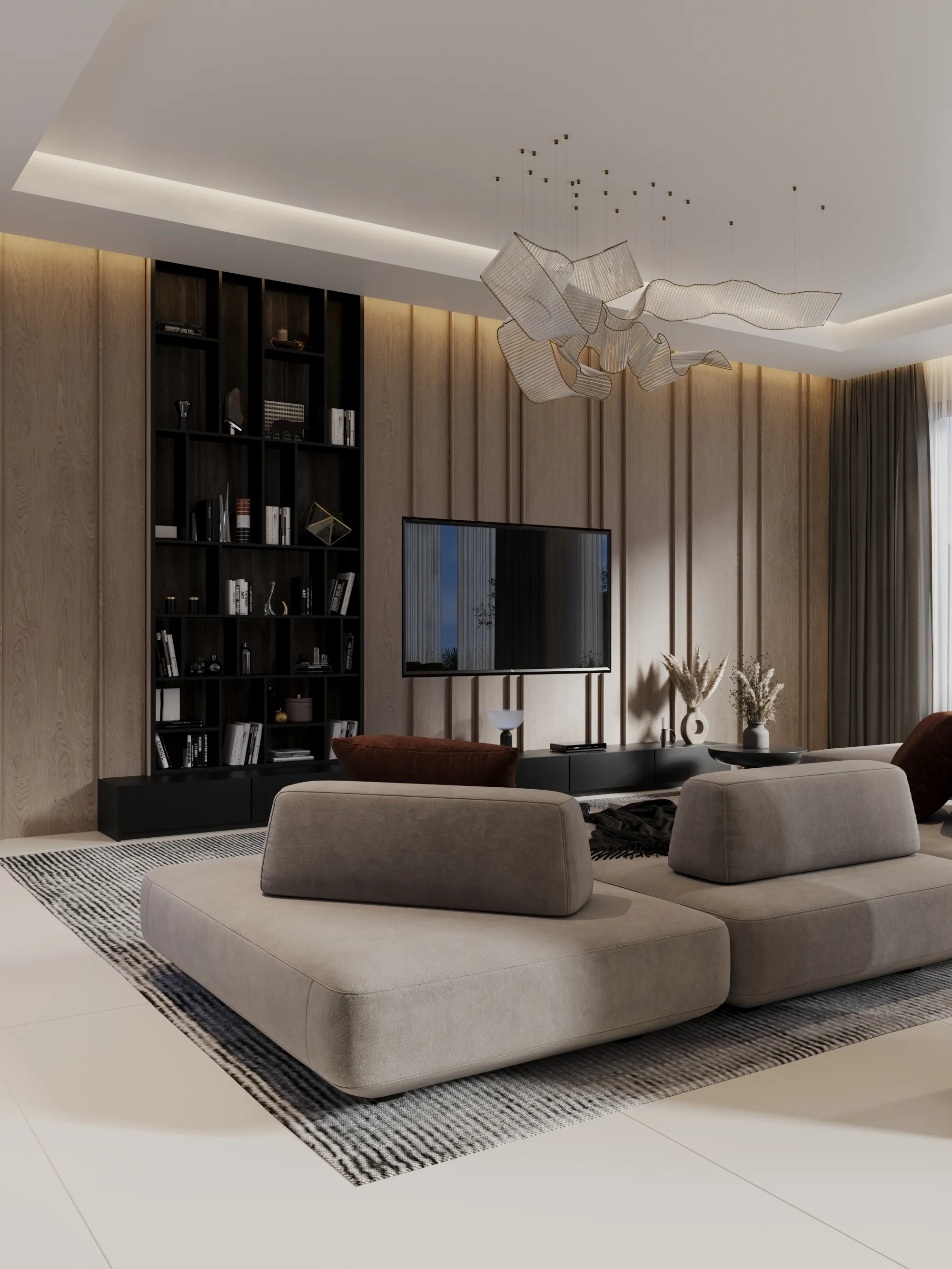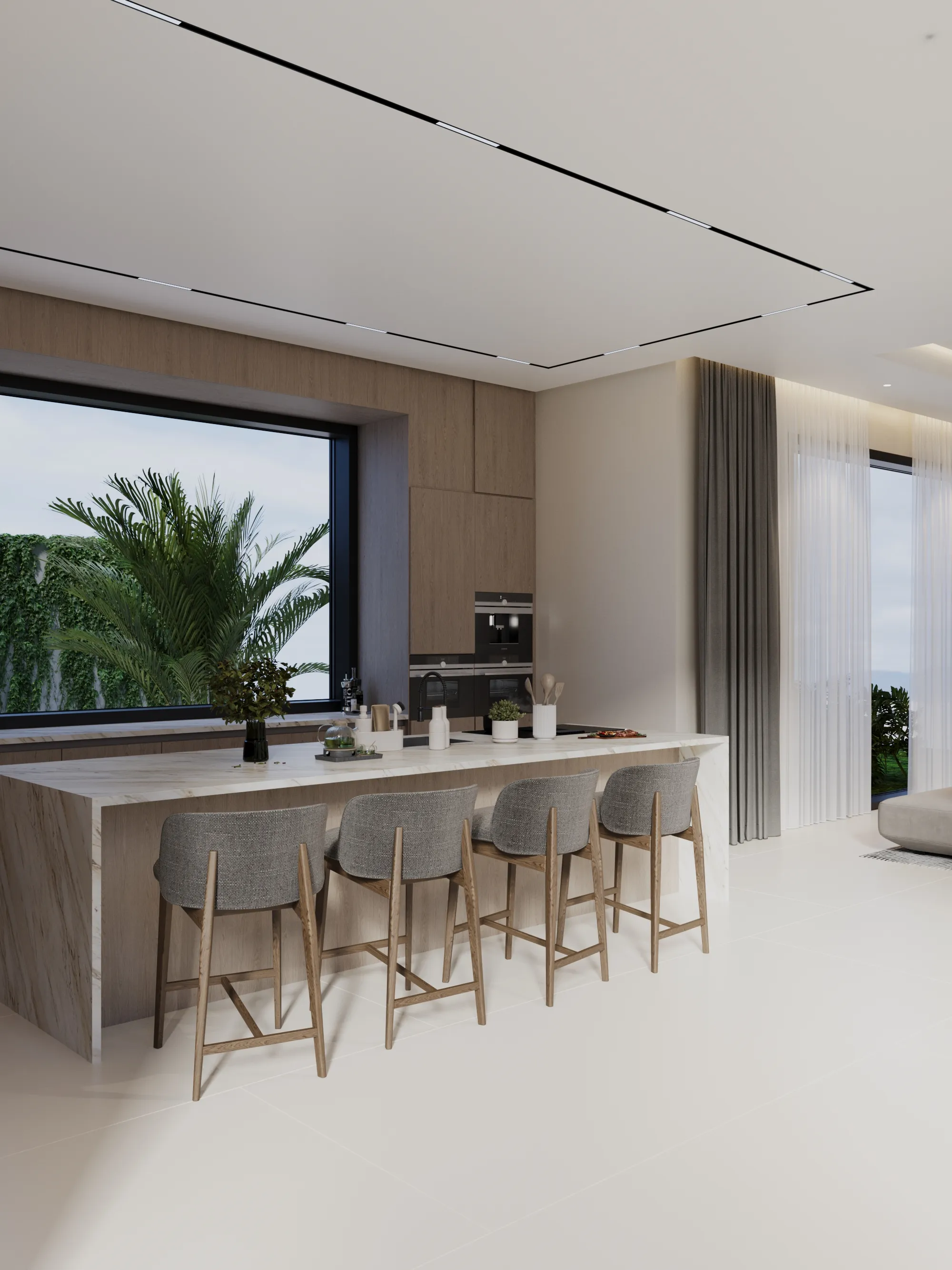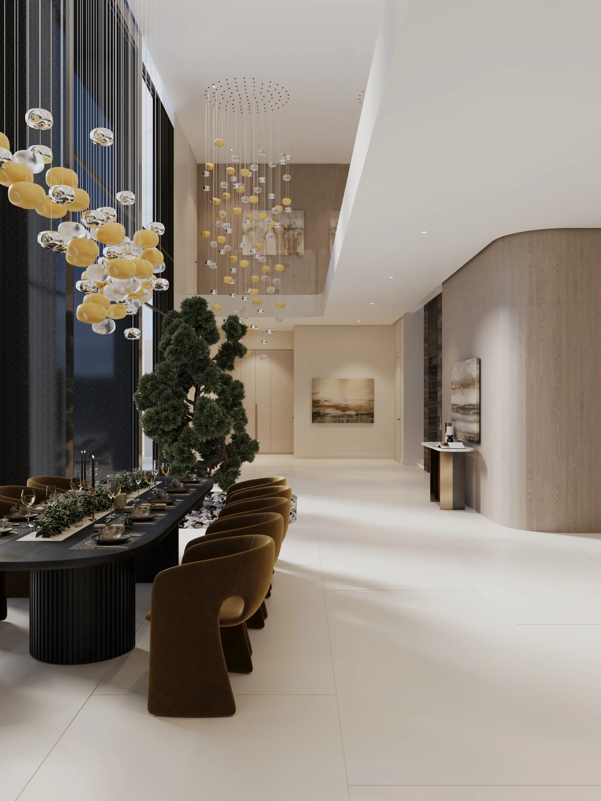 Interior spaces are crafted with a strong focus on material quality, detailing, and sensory comfort. Living areas are defined by dramatic ceiling heights and highlighted by statement lighting features that enhance spatial presence. Floors are finished with premium porcelain surfaces in common areas and hardwood flooring in private rooms, while bespoke wall treatments and architectural panels add depth and character throughout the villa. Kitchens are designed for both presentation and performance, featuring a front-of-house show kitchen alongside a discreet service kitchen, each fitted with premium appliances, custom cabinetry, and refined surface finishes. Furniture and interior styling include designer-selected pieces, plush carpets for acoustic comfort, and carefully curated furnishings that create a warm yet sophisticated living atmosphere.
