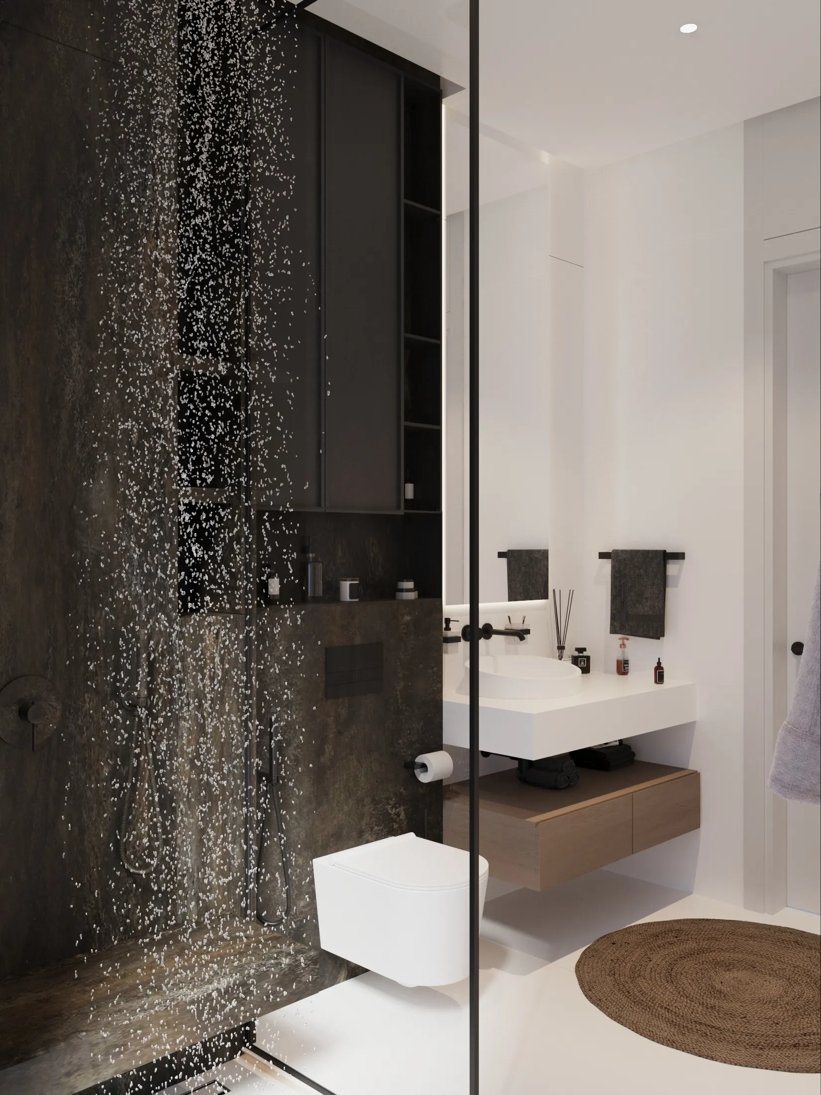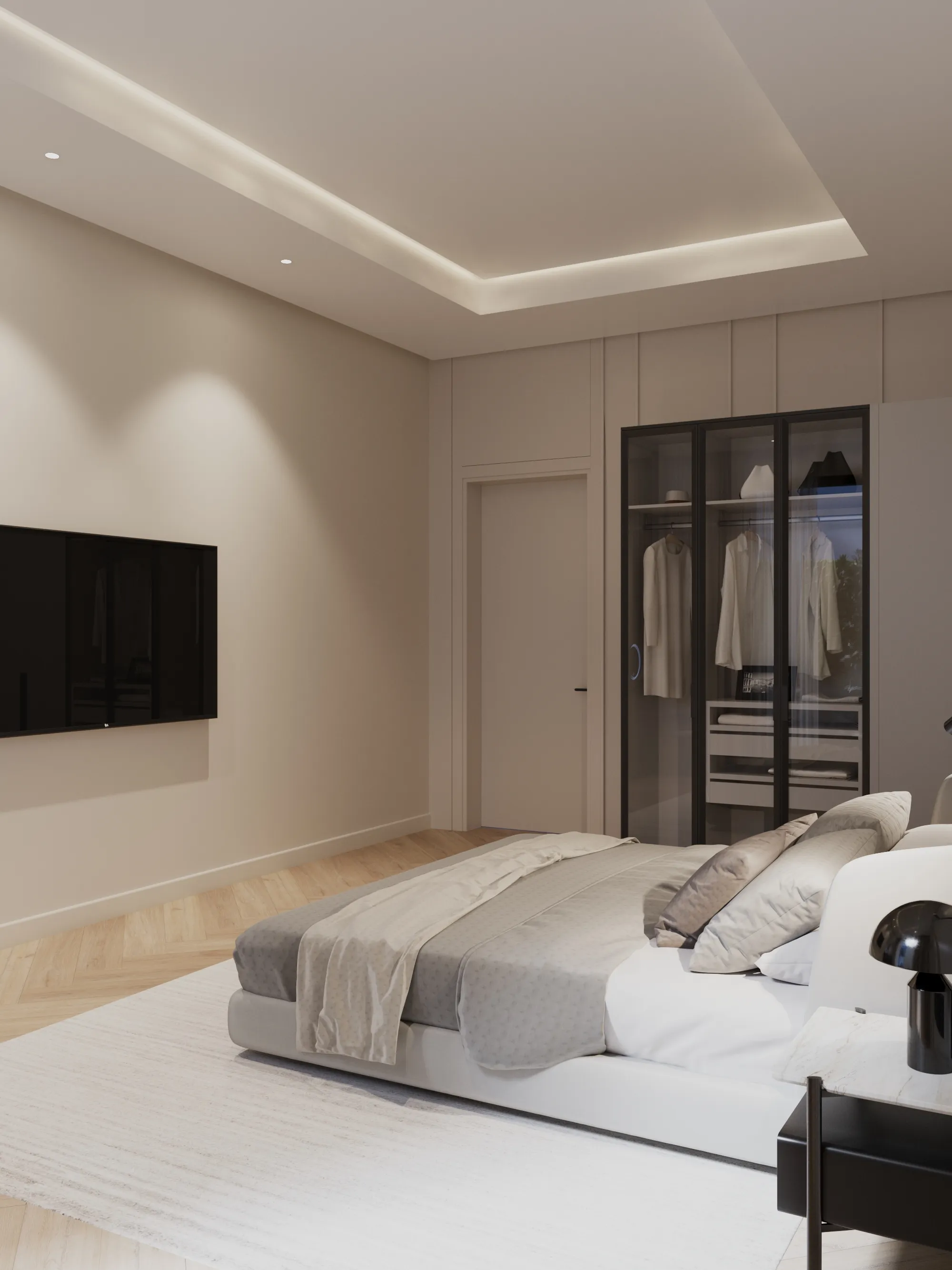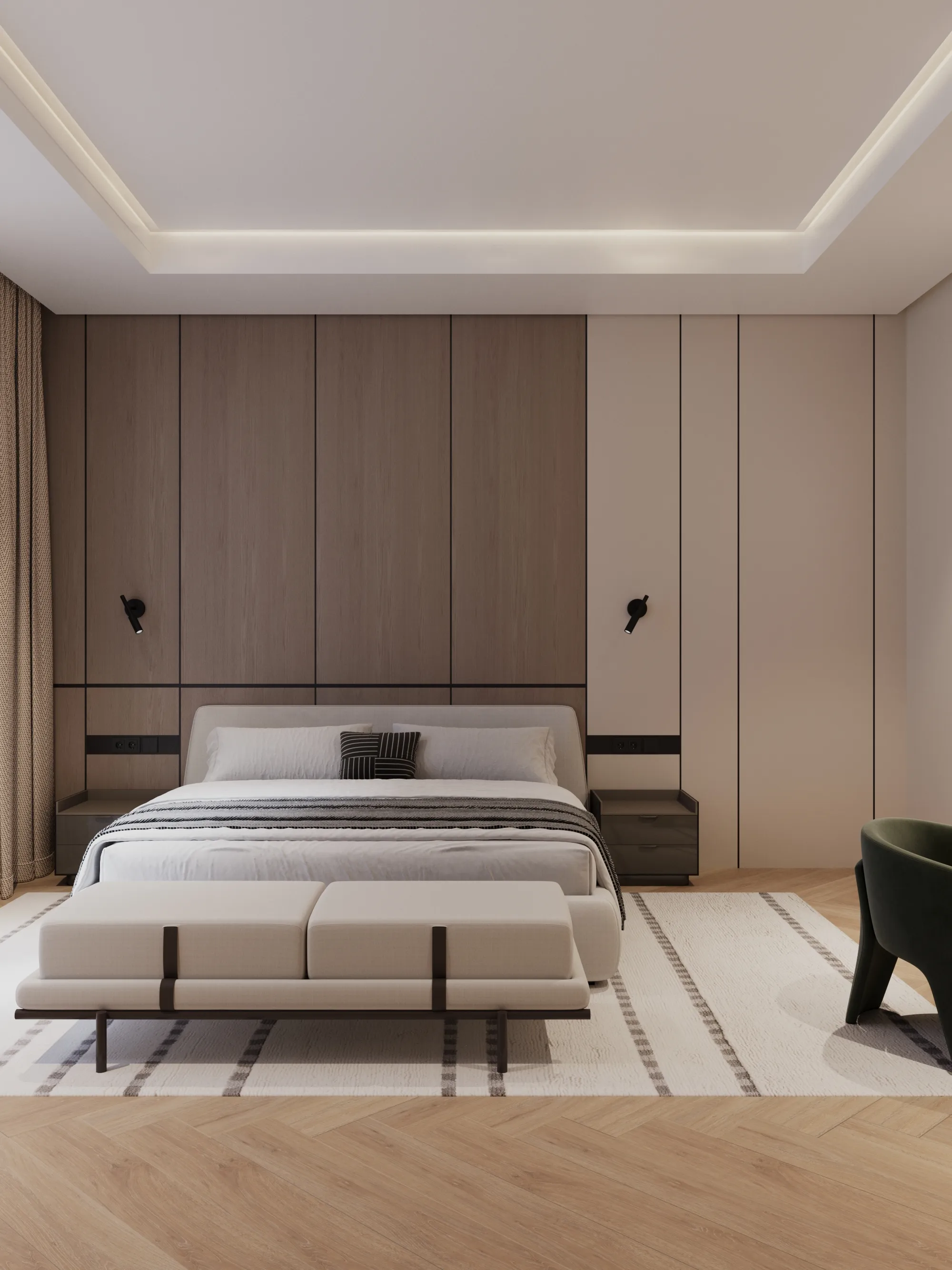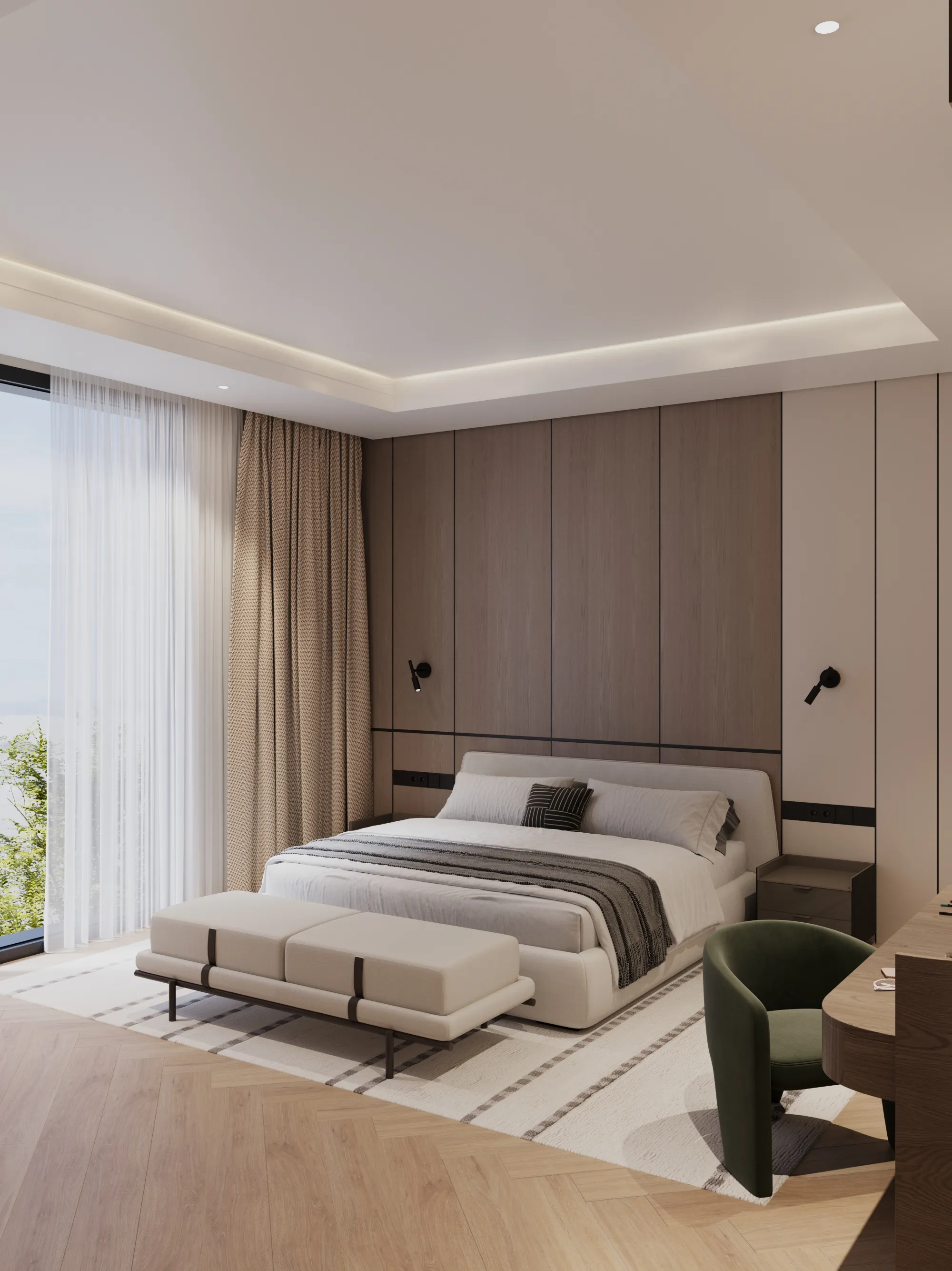 Interior spaces are crafted with a strong focus on material quality, detailing, and sensory comfort. Living areas are defined by dramatic ceiling heights and highlighted by statement lighting features that enhance spatial presence. Floors are finished with premium porcelain surfaces in common areas and hardwood flooring in private rooms, while bespoke wall treatments and architectural panels add depth and character throughout the villa. Kitchens are designed for both presentation and performance, featuring a front-of-house show kitchen alongside a discreet service kitchen, each fitted with premium appliances, custom cabinetry, and refined surface finishes. Furniture and interior styling include designer-selected pieces, plush carpets for acoustic comfort, and carefully curated furnishings that create a warm yet sophisticated living atmosphere.