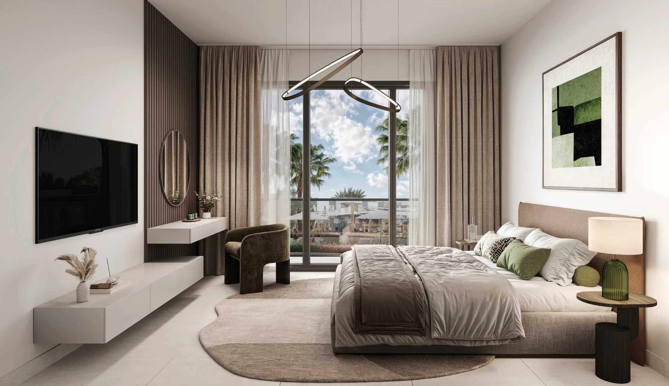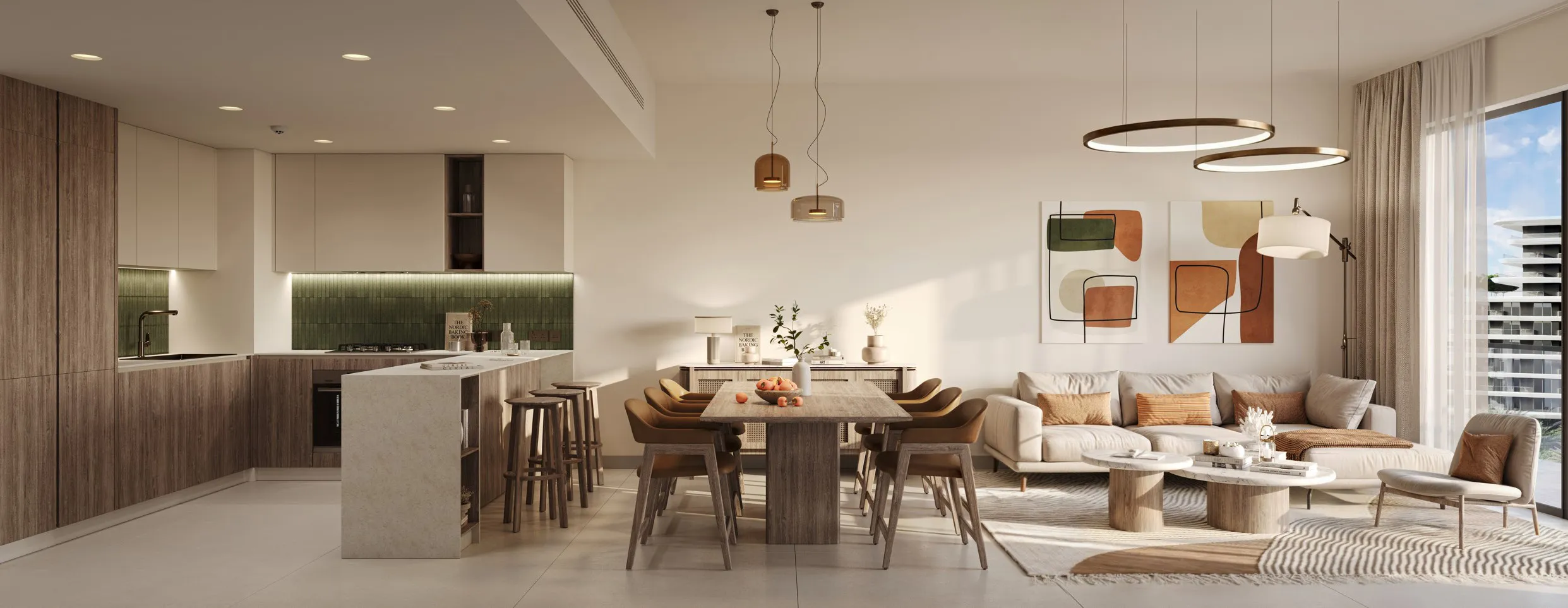 Interiors are designed to reflect an elegant harmony between refined living and organic inspiration. Homes are bathed in natural light and finished with premium materials, offering a choice of light or dark interior palettes inspired by the natural landscape. Kitchens feature engineered stone countertops, contemporary cabinetry, and porcelain finishes, while bathrooms are appointed with high-quality ceramic sanitaryware and brushed bronze fittings. Flooring, wall treatments, and bespoke joinery combine durability with warmth, creating interiors that feel grounded, calming, and effortlessly sophisticate.