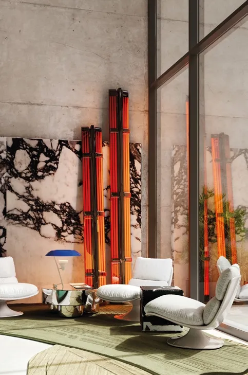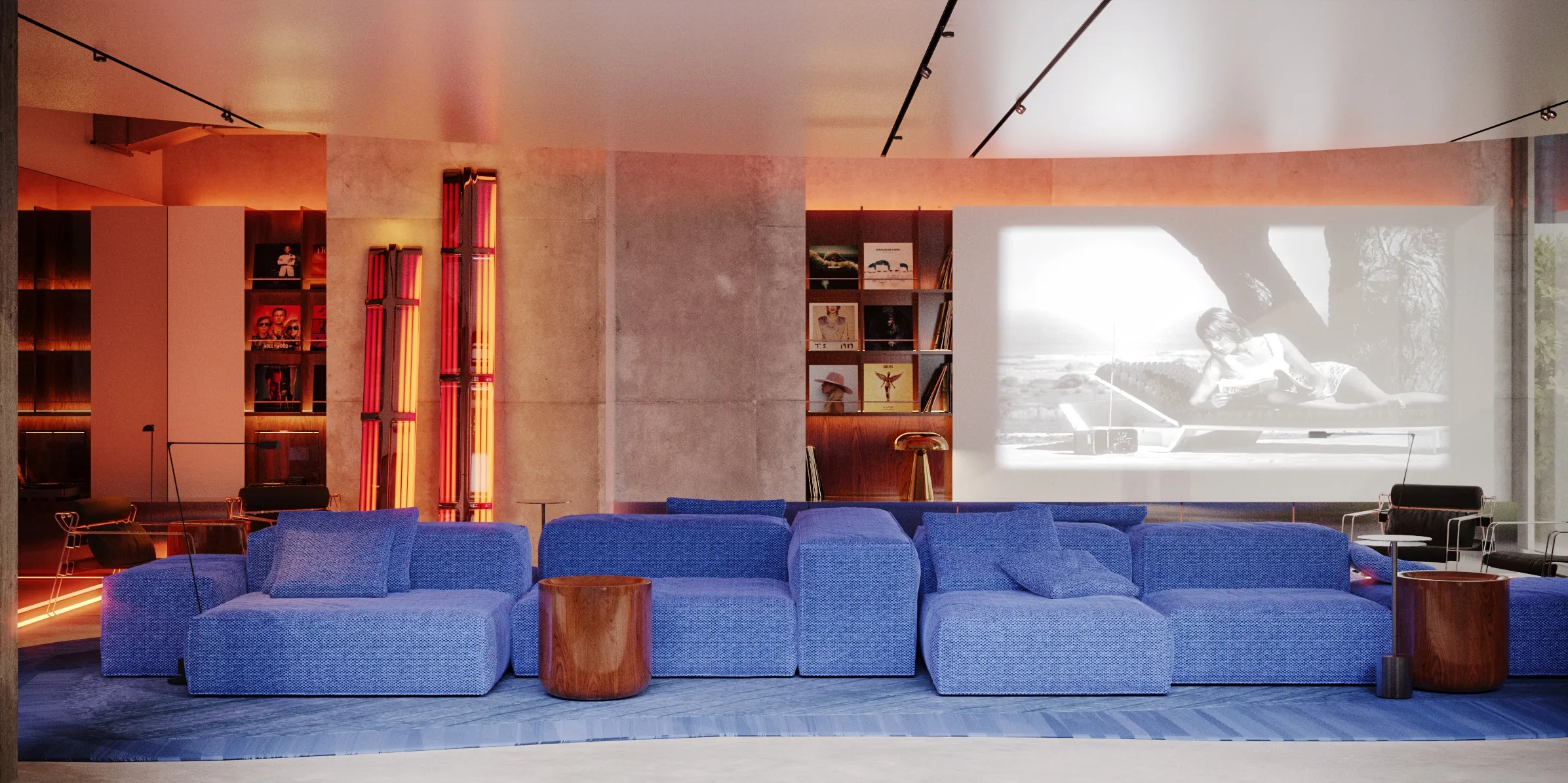 The interiors of Arsenal Dubai are characterized by a sophisticated blend of textures and materials, including polished concrete surfaces, striking marble elements, and warm layered lighting that enhances the architectural atmosphere. Custom-designed furnishings, sculptural decor pieces, and vibrant color accents contribute to a curated, design-forward environment. The project uses a mix of sleek built-ins, high-quality finishes, and expressive artistic elements.